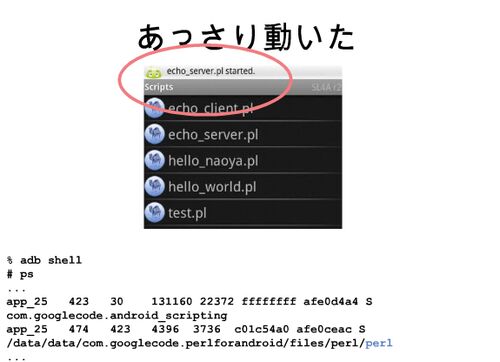 Shibuya Perl Mongers テクニカルトーク#14 に行ってきました。諸々面白かったですがパネルディスカッション、LT ともに id:kazuhooku さんの発表が良かったですね。さて、Scripting Layer for Android (SL4A) を使って、Perl で Android を hack する話をし…